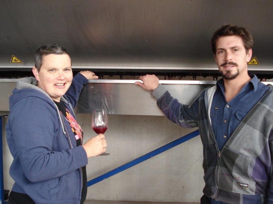 Steph Lambert and Sam Hambour, winemakers at Amisfield, both ex-University of Adelaide – tasting the pinot noir free-run